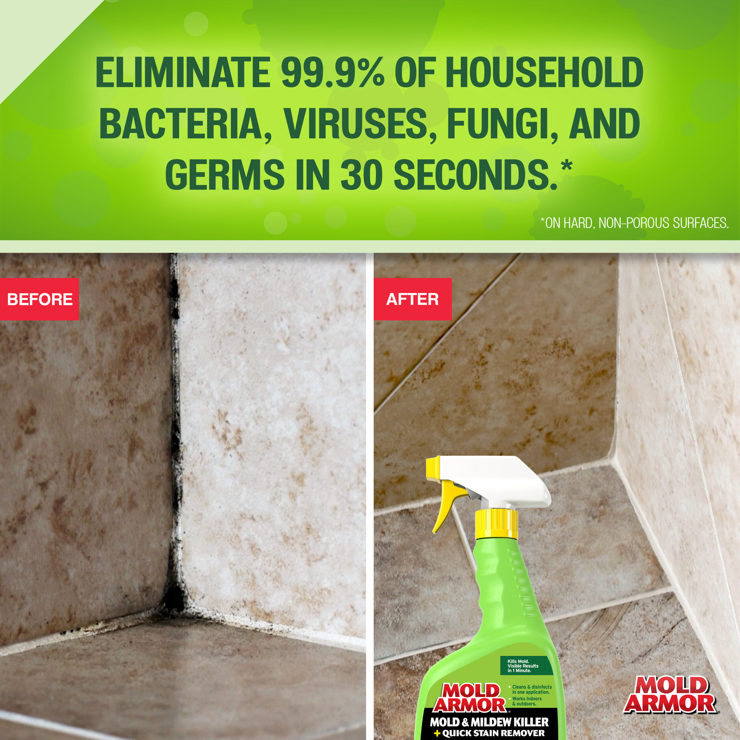 MOLD ARMOR Mold and Mildew Killer plus Quick Stain Remover kills mold and mildew in one application and kills 99.9% of bacteria in 10 seconds. Not just a typical bathroom cleaner, this mold remover spray works wonders on non-porous surfaces including bathtubs, shower doors, toilet seats, countertops, sinks, sealed grout, vinyl, garbage cans, plastic surfaces, sealed fiberglass, sealed granite, glazed porcelain tile, glazed ceramic tile, laminate, formica and linoleum. This mold and mildew remover and shower cleaner spray kills 99.9% of bacteria in 10 seconds and eliminates 99.9% of household bacteria, viruses, fungi, germs in 30 seconds. Nothing will get your shower cleaner than this mold control shower spray. Follow all directions carefully and keep out of reach of children.